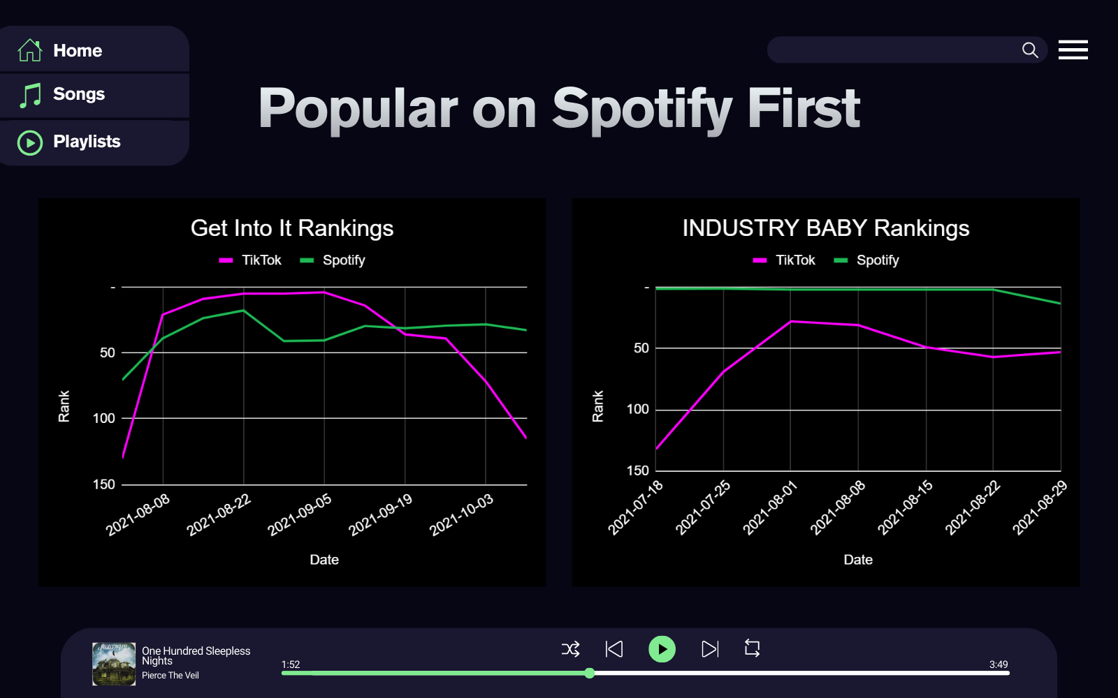 Using Python, Pandas, and Excel, we cleaned and filtered U.S.-based Spotify chart data, focusing on streaming counts, rankings, and date-based trends. Time-series analysis was used to identify peak popularity periods and calculate average rankings before and after TikTok virality. Visualizations created with Matplotlib revealed that Spotify trends are generally more stable, while TikTok trends fluctuate rapidly due to short-form content cycles. This analysis highlighted how platform algorithms, user behavior, and content format affect music discovery.