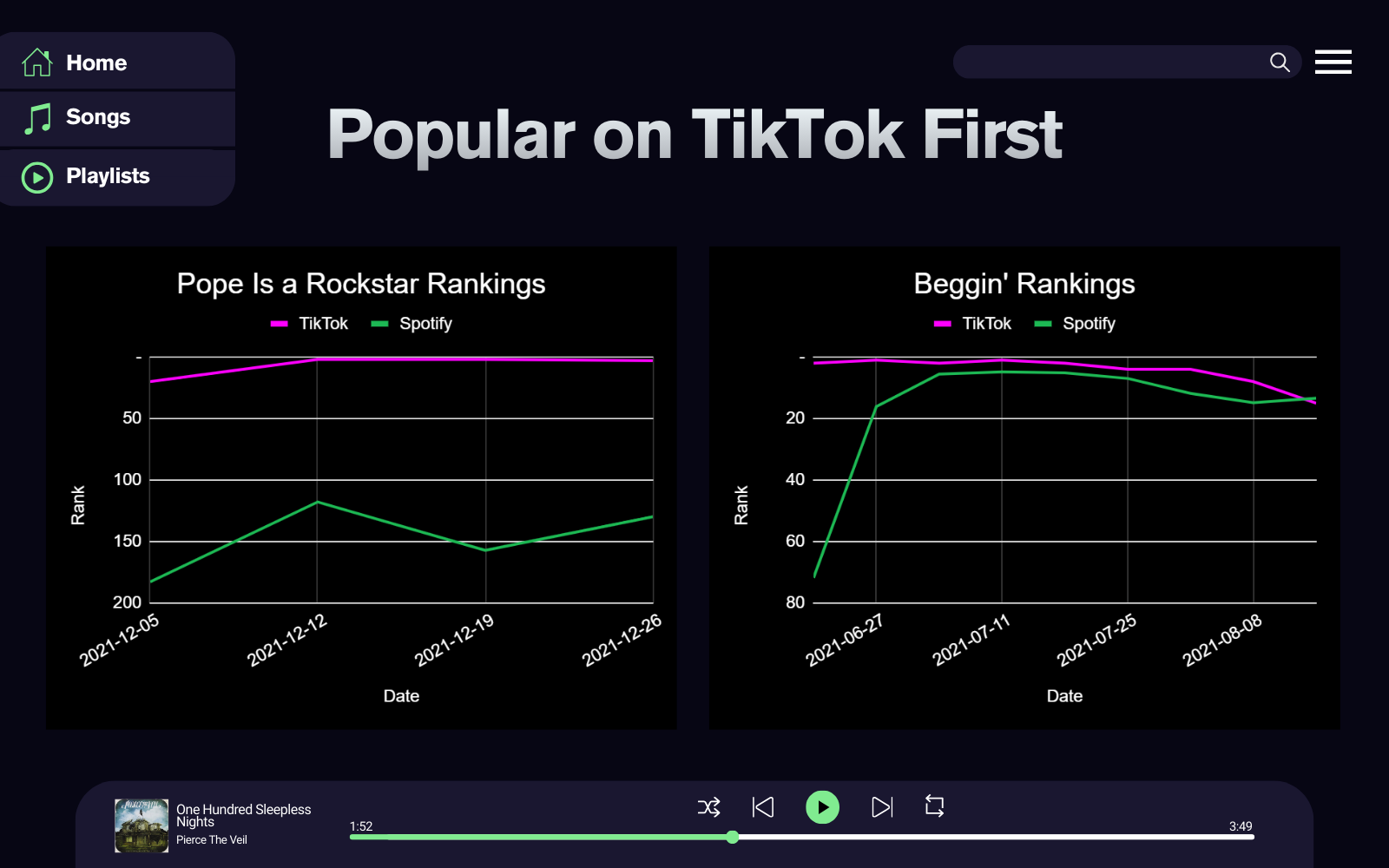 This project explores the relationship between TikTok virality and Spotify chart performance to understand which platform influences music popularity first. Using streaming and ranking data from Spotify alongside trending TikTok songs, we analyzed how songs gain traction across platforms over time. Our initial hypothesis assumed TikTok consistently drives Spotify success, reflecting the platform’s viral nature. To test this, we tracked when songs peaked on each platform and compared their performance trends.